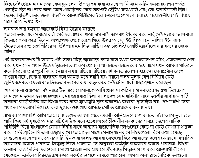 তিনি আরও লিখেন, দেশের স্থিতিশীলতার জন্য রিফাইন্ড আওয়ামীলীগের ইলেকশনে অংশগ্রহণ করা যে প্রয়োজনীয় সেই বিষয়ে সরাসরি অভিমত ছিল। হাসনাত তার বক্তব্যে আরেকটি বিষয় উল্লেখ করেছে- “আলোচনার এক পর্যায়ে বলি-যেই দল এখনো ক্ষমা চায় নাই, অপরাধ স্বীকার করে নাই,সেই দলকে আপনারা কিভাবে ক্ষমা করে দিবেন! অপরপক্ষ থেকে রেগে গিয়ে উত্তর আসে,’ ইউ পিপল নো নাথিং। ইউ ল্যাক উইজডোম এন্ড এক্সপিরিয়েন্স। উই আর ইন দিজ সার্ভিস ফর এটলিস্ট ফোর্টি ইয়ার্স।তোমার বয়সের থেকে বেশি।” এই কনভারসেশন টা হয়েছে এটা সত্য। কিন্তু আমাদের রুমে বসে হওয়া কনভারসেশন হঠাৎ এককভাবে শেষ করে যখন সেনাপ্রধান উঠে দাঁড়ালেন এবং রুম থেকে কথা বলতে বলতে বের হয়ে এসে যখন আমরা গাড়িতে করে ফিরবো তার পূর্বে বিদায় নেয়ার সময় দাঁড়িয়ে দাঁড়িয়ে এই কনভারসেশন হয়েছে। সেনাপ্রধান রেগে যাওয়ার সুরে এই কথা বলেছেন বলে আমার মনে হয়নি বরং বয়সে তুলনামূলক বেশ সিনিয়র কেউ জুনিয়রদেরকে যেভাবে অভিজ্ঞতার ভারের কথা ব্যক্ত করে সেই টোন এবং এক্সপ্রেশনে বলেছেন।