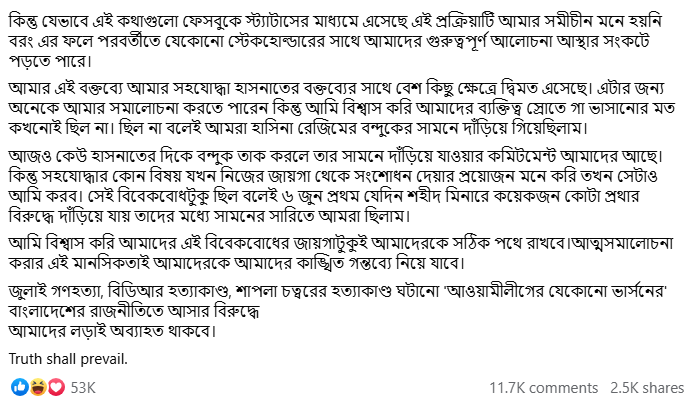 তিনি লিখেন, কিন্তু যেভাবে এই কথাগুলো ফেসবুকে স্ট্যাটাসের মাধ্যমে এসেছে এই প্রক্রিয়াটি আমার সমীচীন মনে হয়নি বরং এর ফলে পরবর্তীতে যেকোনো স্টেকহোল্ডারের সাথে আমাদের গুরুত্বপূর্ণ আলোচনা আস্থার সংকটে পড়তে পারে। আমার এই বক্তব্যে আমার সহযোদ্ধা হাসনাতের বক্তব্যের সাথে বেশ কিছু ক্ষেত্রে দ্বিমত এসেছে। এটার জন্য অনেকে আমার সমালোচনা করতে পারেন কিন্তু আমি বিশ্বাস করি আমাদের ব্যক্তিত্ব স্রোতে গা ভাসানোর মত কখনোই ছিল না। ছিল না বলেই আমরা হাসিনা রেজিমের বন্দুকের সামনে দাঁড়িয়ে গিয়েছিলাম।