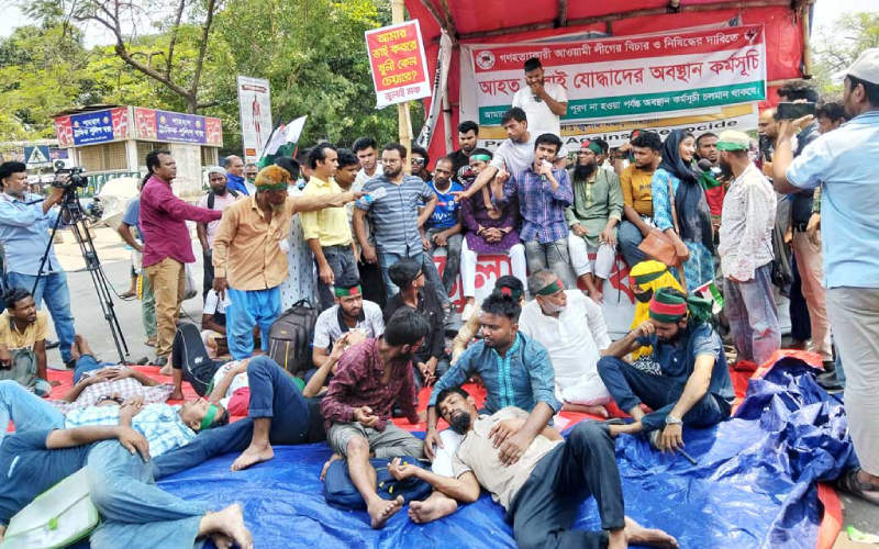 আওয়ামী লীগ নিষিদ্ধ, আহত জুলাই যোদ্ধাদের সুচিকিৎসা ও পুনর্বাসন এবং জুলাই সনদ ঘোষণার ৩ দফা দাবিতে শাহবাগ অবরোধ করেছে জুলাইয়ের আহত যোদ্ধারা।