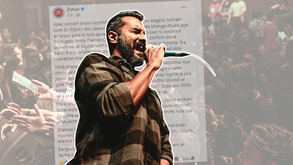 প্রায়শই কনসার্ট নিয়ে উঠা বিশৃঙ্খলার এমন অভিযোগ নিয়ে এবার কথা বললেন ব্যান্ড ‘নেমেসিস’-এর জোহাদ রোজা চৌধুরী। শুক্রবার রাতে এক দীর্ঘ ফেসবুক স্ট্যাটাসে চলমান সময়ে কনসার্টগুলোর অভিজ্ঞতার নিরিখে সরব হন তিনি।